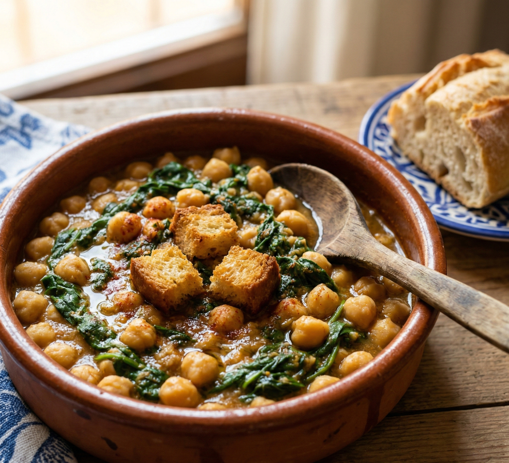 No hay plato que defina mejor la cocina de diario sevillana. Cocinamos los garbanzos a fuego lento hasta que están mantecosos, mezclándolos con espinacas frescas de la huerta. El secreto está en el «majado»: una base de pan frito, ajos, comino y pimentón de la Vera que le da esa textura espesa y ese aroma inconfundible. Es un plato reconfortante, humilde y lleno de historia, servido con un par de costrones de pan frito por encima.
